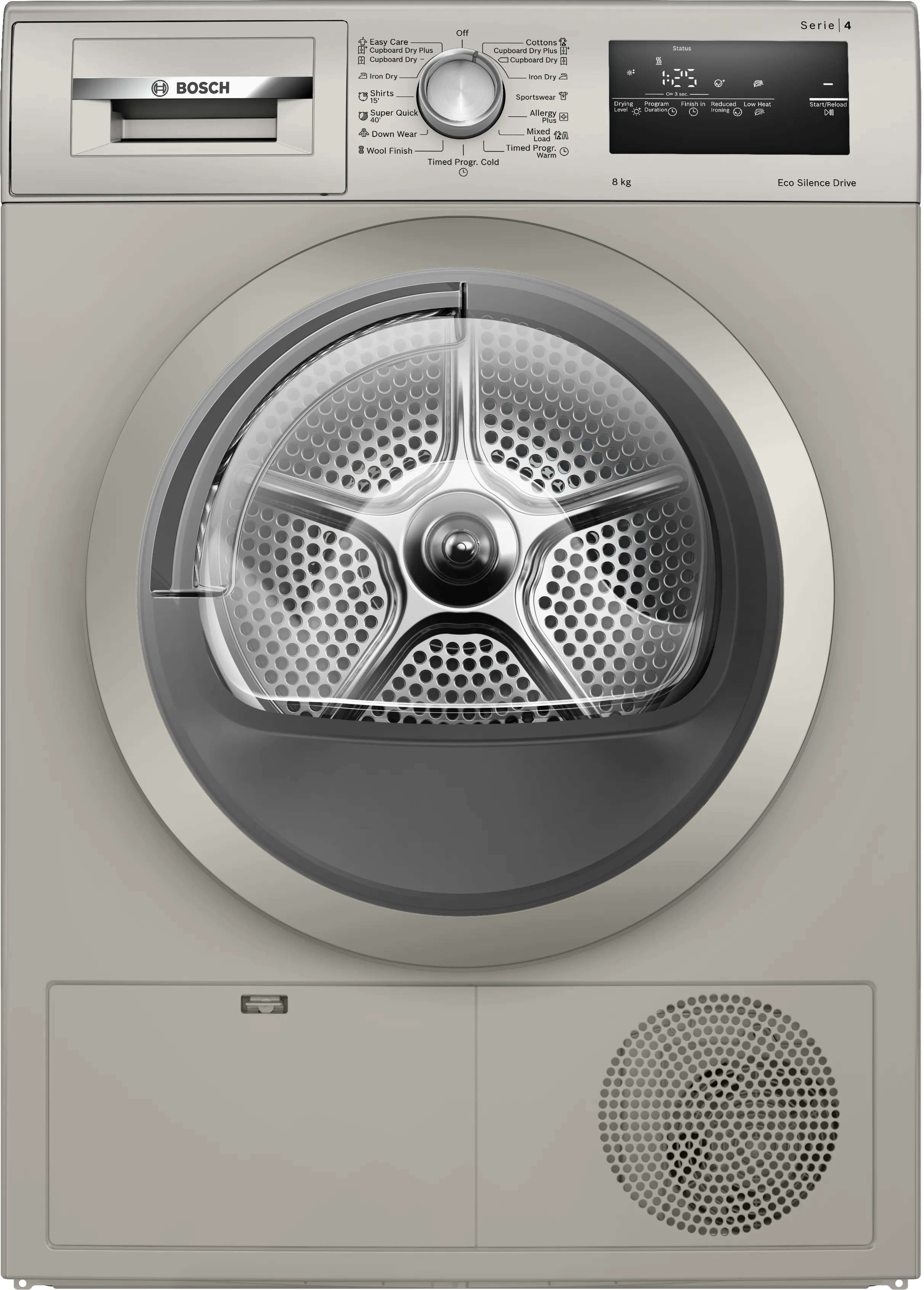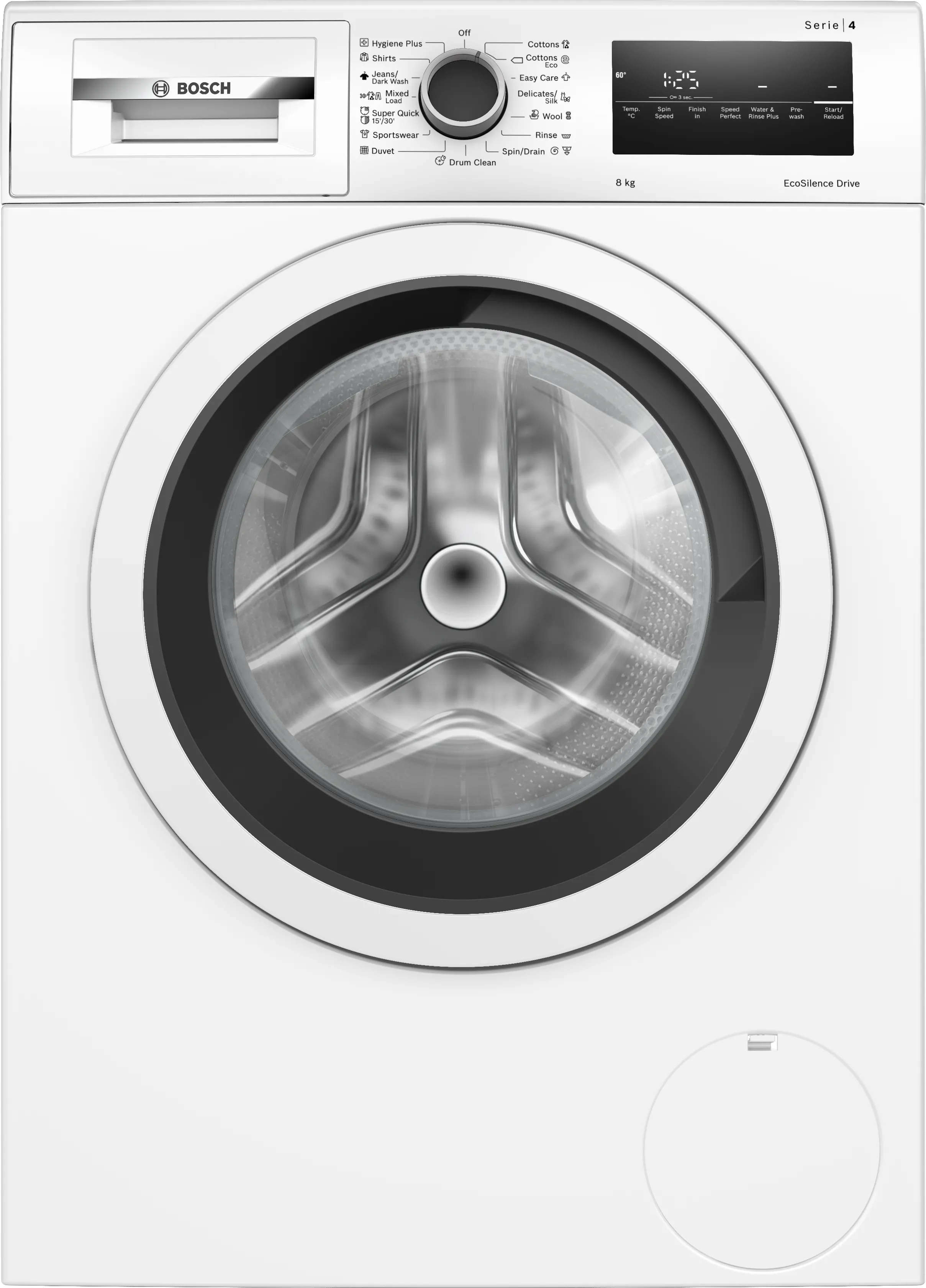Front-loading washing machine from Bosch Series 8 with 9 kg maximum load capacity, 1400 RPM maximum spin speed, A+++ energy efficiency rating, EcoSilence Drive inverter motor for quiet and energy-efficient operation, LED display with mechanical controls, 14 washing programs including specialized cycles for various fabric types and stains, ActiveWater Plus for automatic water management, AntiStain System, VarioDrum for gentle fabric care, SpeedPerfect for faster cycles, Home Connect for remote control, water protection systems, and multiple convenience features.