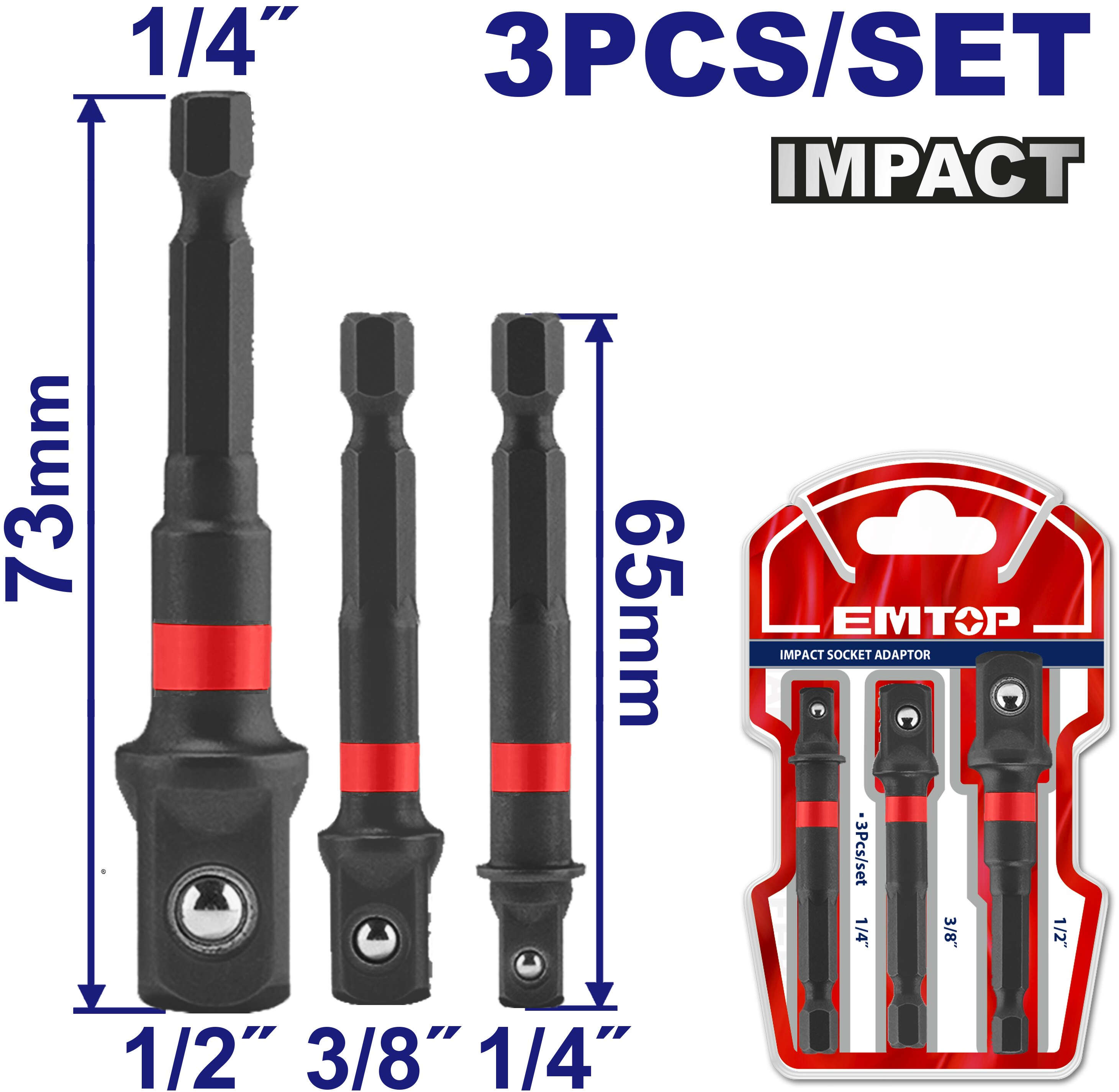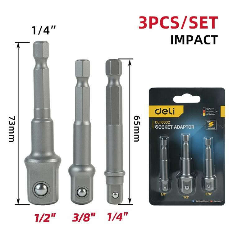 Socket adapter that converts a 1/2" square drive impact wrench into an impact driver for 1/4" hex bits. Allows use of standard impact screwdriver / hex bits on an impact wrench.